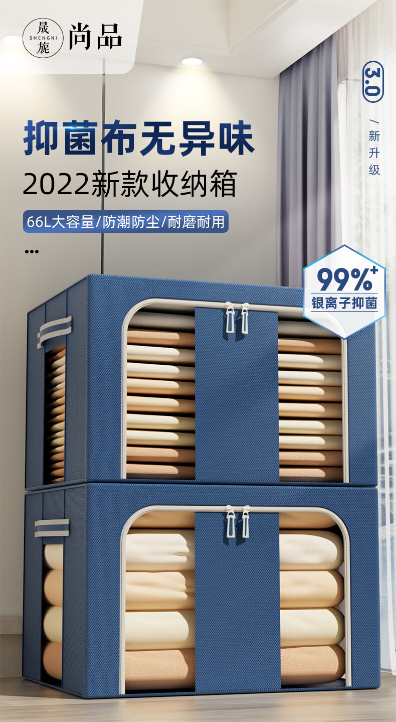 晟旎尚品 收纳箱抗菌66L大号3只装衣服棉被布艺整理箱牛津布折叠储物箱
